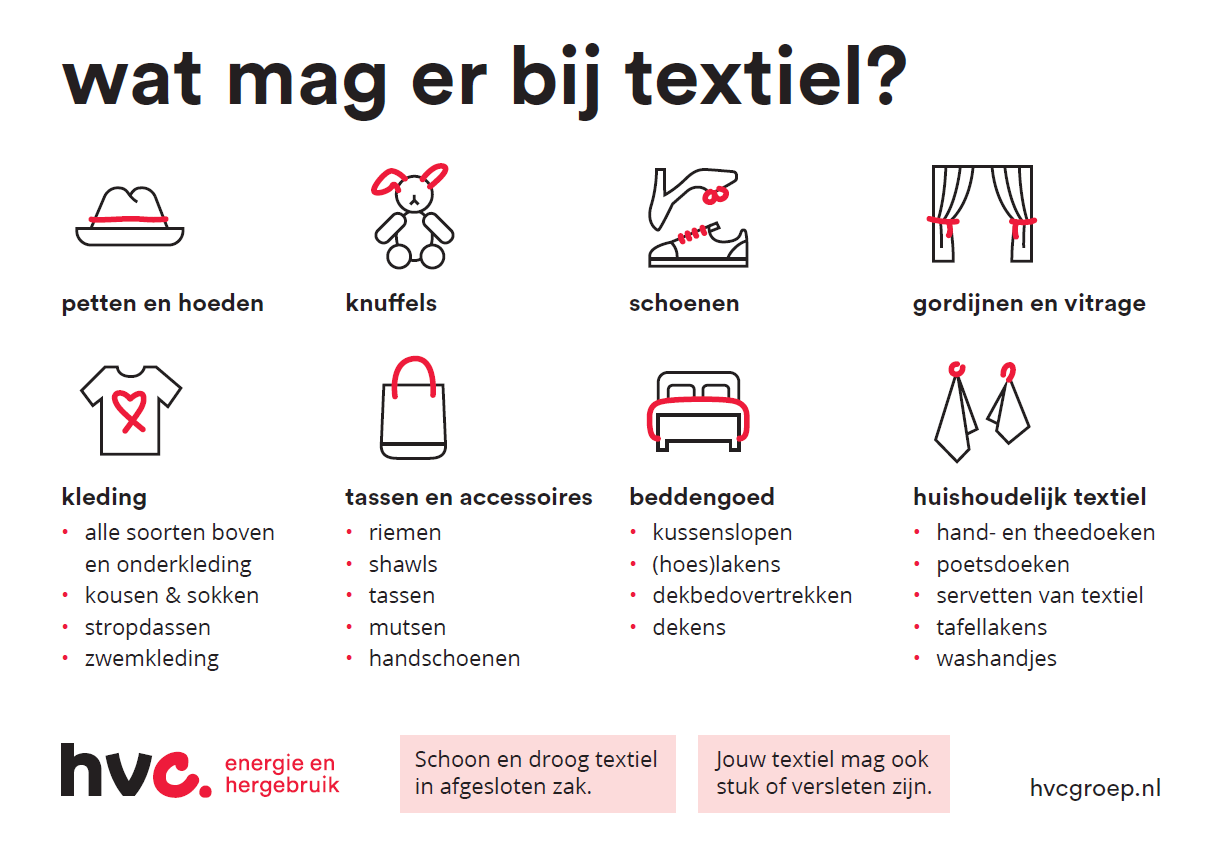 Voor het inzamelen van textiel werken we samen met Kringloopbedrijf Opnieuw & Co en afvalinzamelaar HVC.